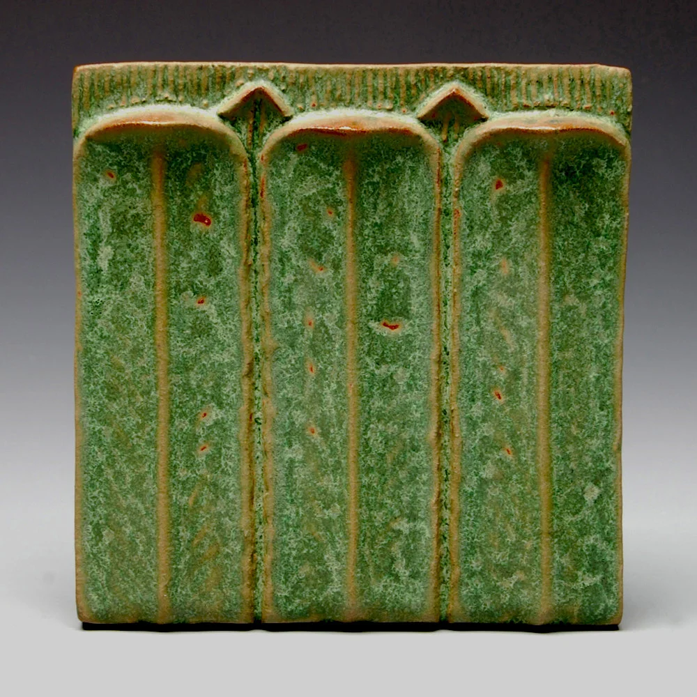 Earthenware sculptural relief tile. Earthenware glazes. Tile dimensions 6" x6" x3/4". Hanger applied to the back. Please allow two to three weeks for this item to be ready to ship.