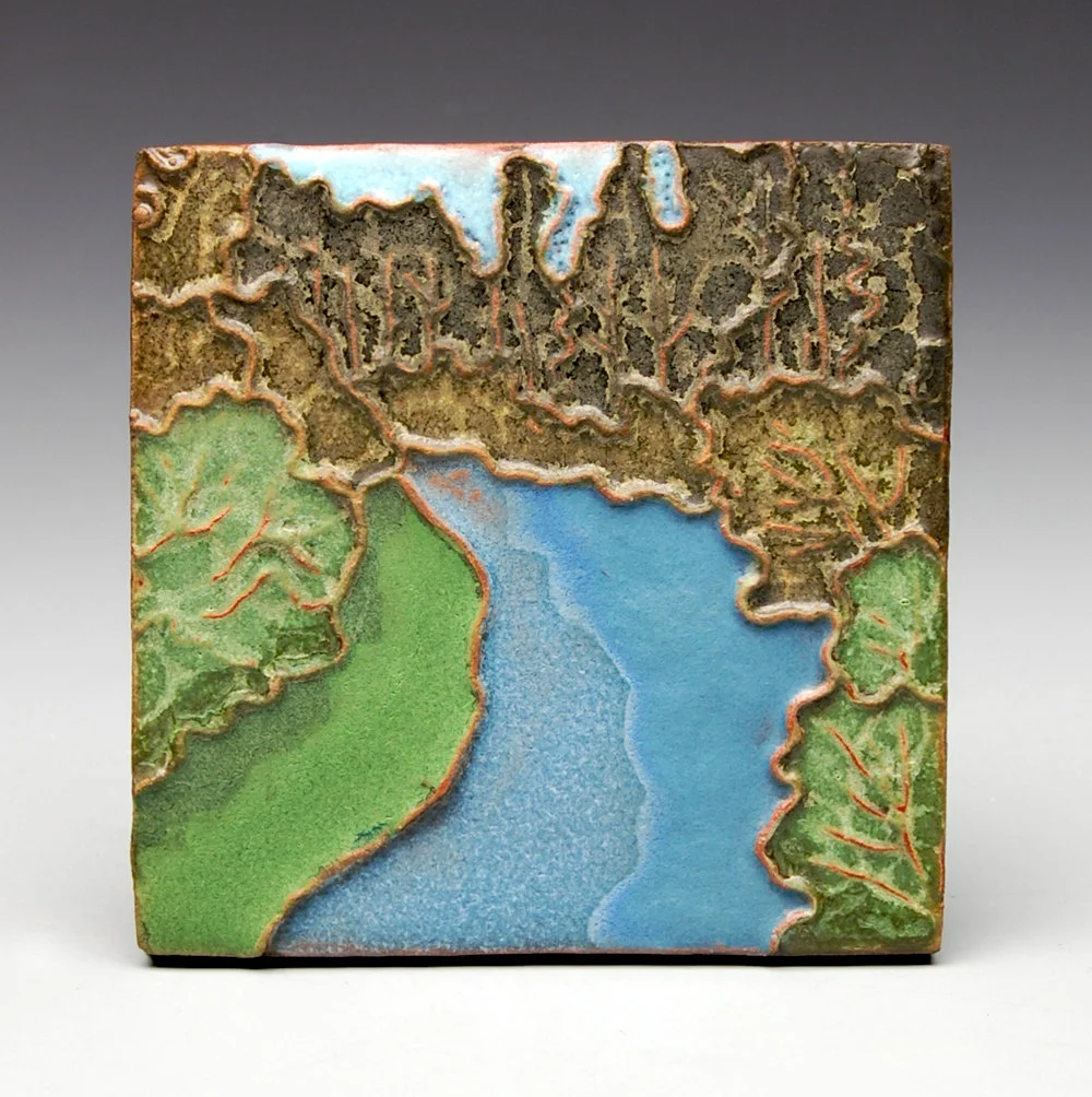 Earthenware cuenca tile. Earthenware glazes. Tile dimensions 4" x 4" x3/8". Hanger applied to the back. Please allow two to three weeks for this item to be ready to ship.
